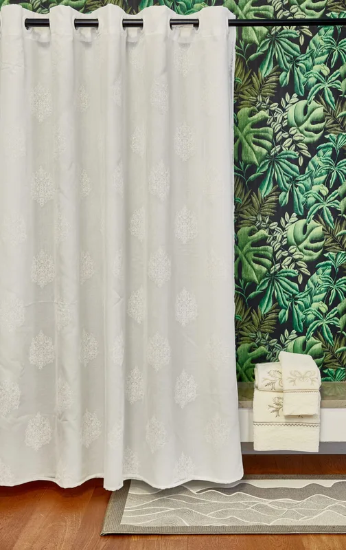 וילון לאמבטיה עשיר ואיכותי במיוחד עשוי מבד יוקרתי בעיצוב מודרני המשלב דוגמא עדינה בהבלטה ייחודית המוסיפה אלמנט עיצובי לחדר האמבטיה. הוילון כולל גם שכבת הגנה איכותית מחומר עבה במיוחד המונעת חדירת מים. הוילון תפור עם רינגים מפלסטיק מותאמים במיוחד לחדר האמבט ומאפשרים גם תליה קלה ונוחה על כל מוט והסטה מהירה של הוילון.