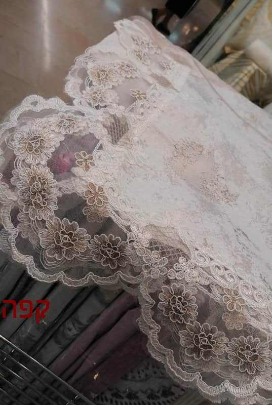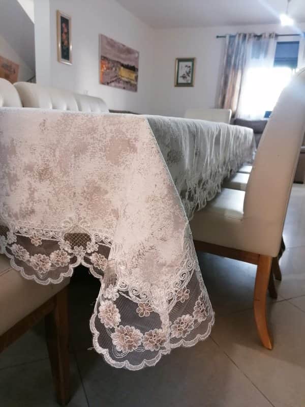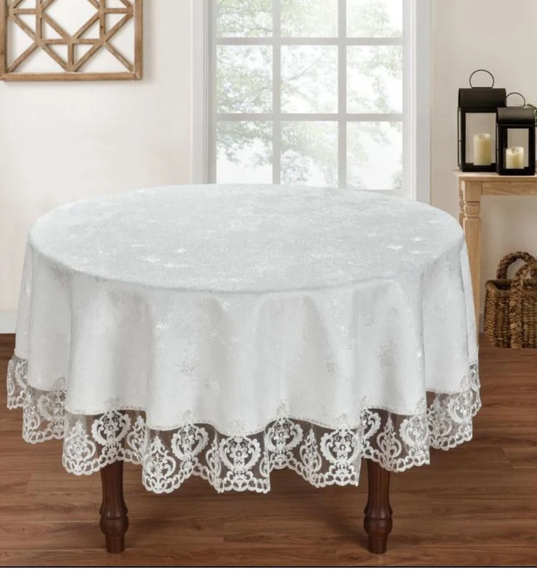 מפת אוכל יוקרתית המשלבת בד מעוטר עם תחרה מסביב השולחן, למתן מראה אלגנטי מעודן.